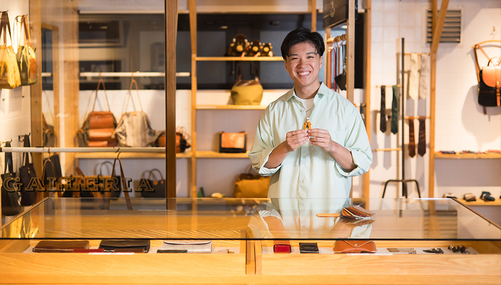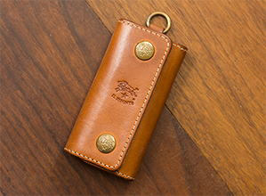 IL BISONTEに異動したタイミングで購入したキーケースは、自分にとって初めてのヌメ革製品。ヌメ革はエイジングで色が変化していくことも、IL BISONTEに来て初めて知りました。なので「育てて」みようと思って、ちゃんとケア用のクリームも買って、ちょっと乱暴ですが家の車のボンネットに置いて日焼けさせています。いい感じの色になってきたし、濡らしてしまった部分はしっかり跡がつくし、自分の生活感が出て面白いなと思います。以前はこういうものを使っていなくて、しょっちゅう鍵をなくしていましたが、それもなくなったので、買ってよかったです(笑)。
