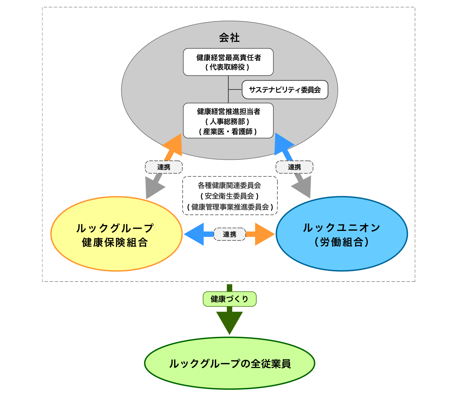 ルックグループでは、健康経営最高責任者(代表取締役)の下、会社・健康保険組合・労働組合が三位一体になって連携し、従業員の健康づくりを推進していきます。